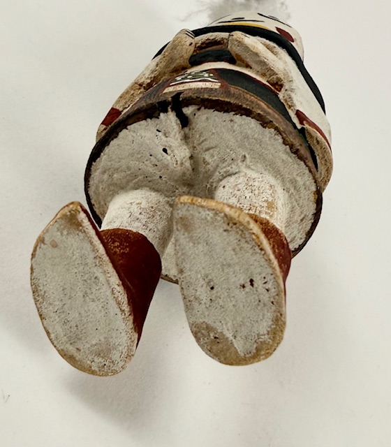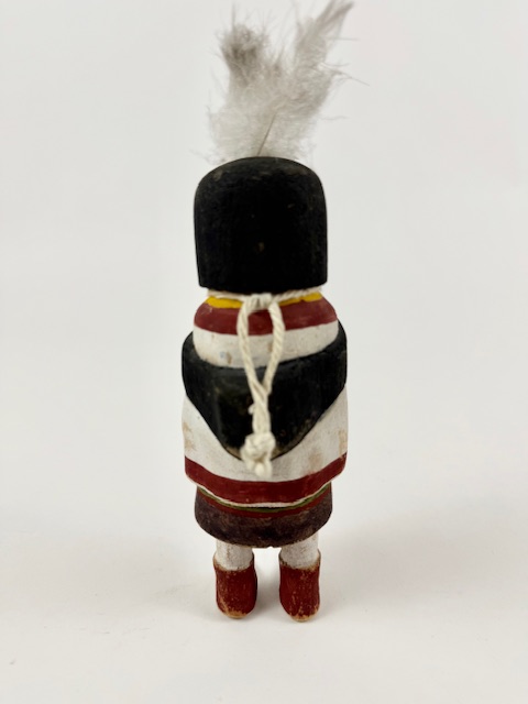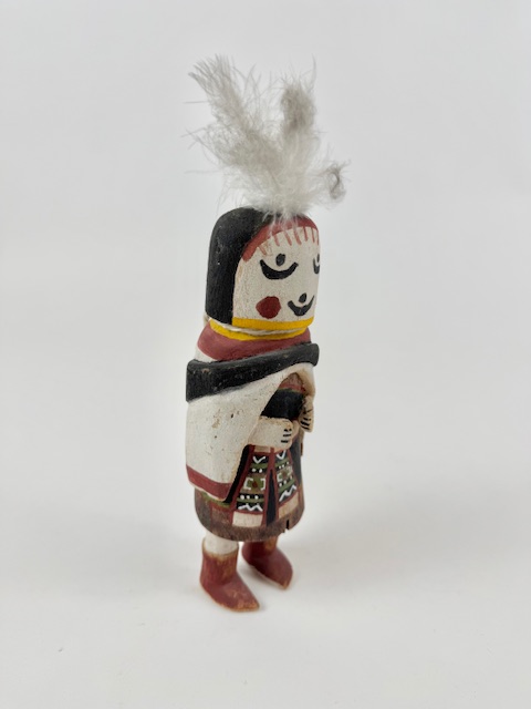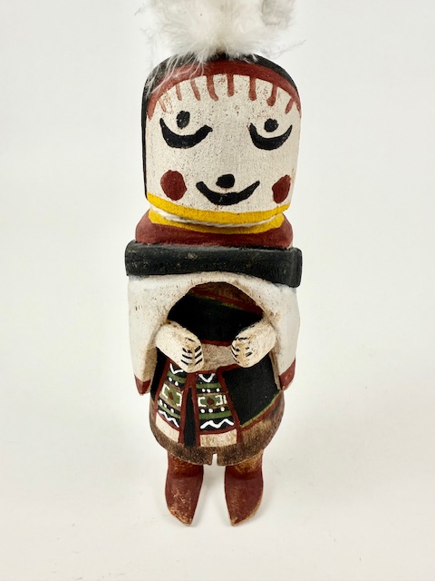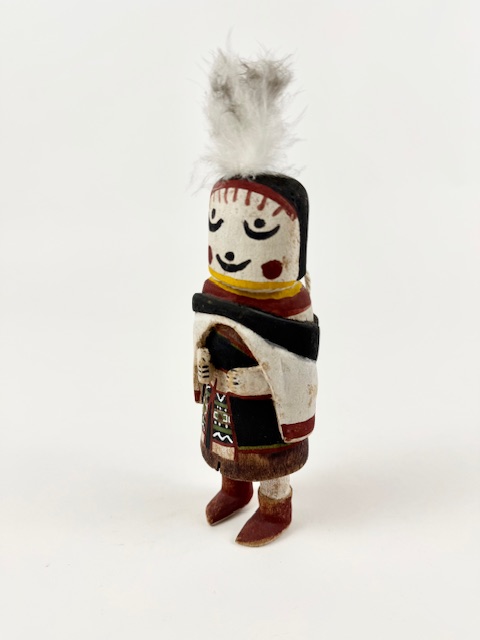 Straight forward Hahay’wuuti, sometimes referred to as the Grandmother, from the 1940s or so. Her endearing face is well executed. She is 7 1/2″ tall with the feathers adding 2″. Some expected wear to the paint given her 80 years of existence. Hahay is said to represent the ideal features of womanhood.