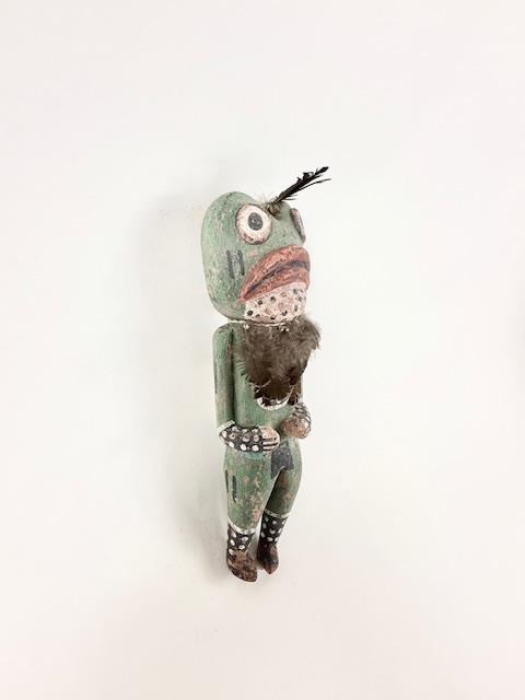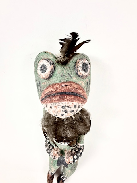 My understanding is that Paakwa or Frog katsinam have appeared on Hopiland only recently (within the last several decades). They certainly are a favorite of mine. Manuel Denet Chavarria created this in his distressed style. It is a humorous example and is 10″ tall and 3″ wide. Manny is featured in our article on distressed katsinam in the August/September issue of Native American Art magazine. It is a wall hanger.