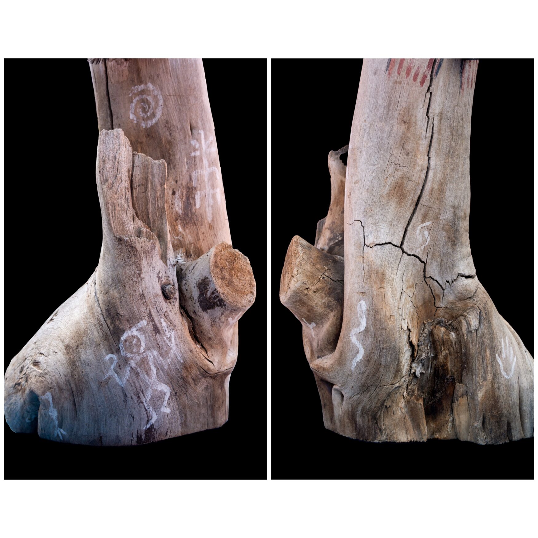 In my opinion, this is Max Curley’s magnum opus: a large double Masaw carving which he made from what he calls “gnarly wood.” This piece takes unusual raw wood and transforms it into a sculptural form. One side depicts the male Masawkatsina and the other his female partner, Masawmana. The carving of the two is exceptional by itself, but what really puts the piece over the top are all the Hopi symbols/ petroglyphs he has added. He told us that the symbols include corn, migration, snakes, rain clouds, friendship, handprints, warrior shields, bird tracks, a crane and Ewtoto, the Father katsina. This carving features a thorough inventory of Hopi symbology. The sculpture is 22″ tall including the pahos on the head (which are removable for shipping), 8 1/2″ wide and 6″ deep. This piece is featured on pages 116 and 117 in our Native American Art magazine article on distressed dolls in the August/ September 2025 issue.