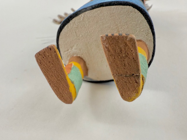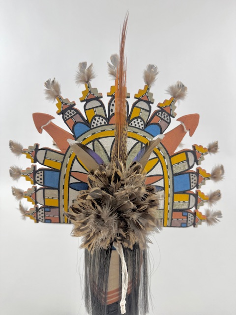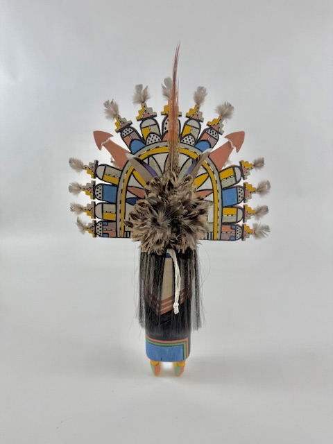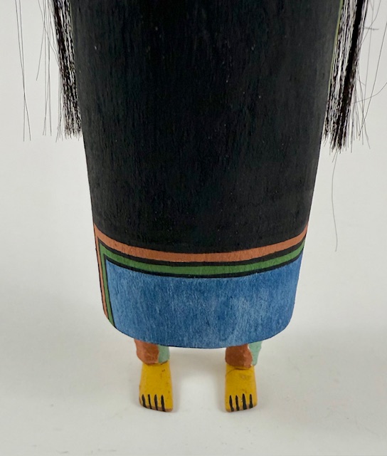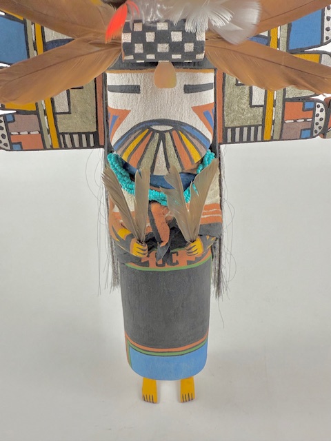 This is a large elaborate, beautifully made Palhikwmana by noted carver, Sandra Suhu. Note the complexity of the tablita which bears rain, clouds and lightning symbols. The figure is wearing a real hand-beaded necklace and a hand-painted cloth shawl over her shoulders. The featherwork on this piece is elaborate. There is a repaired crack on the left foot which is not visible when she is hung on a wall but can be seen if the bottom of the foot is examined (See the last photo). I have reduced the price accordingly. A beautiful rendition. Sandra is featured in my 2024 book, “Hopi Katsina Anomalies,” Rio Nuevo, Tucson.